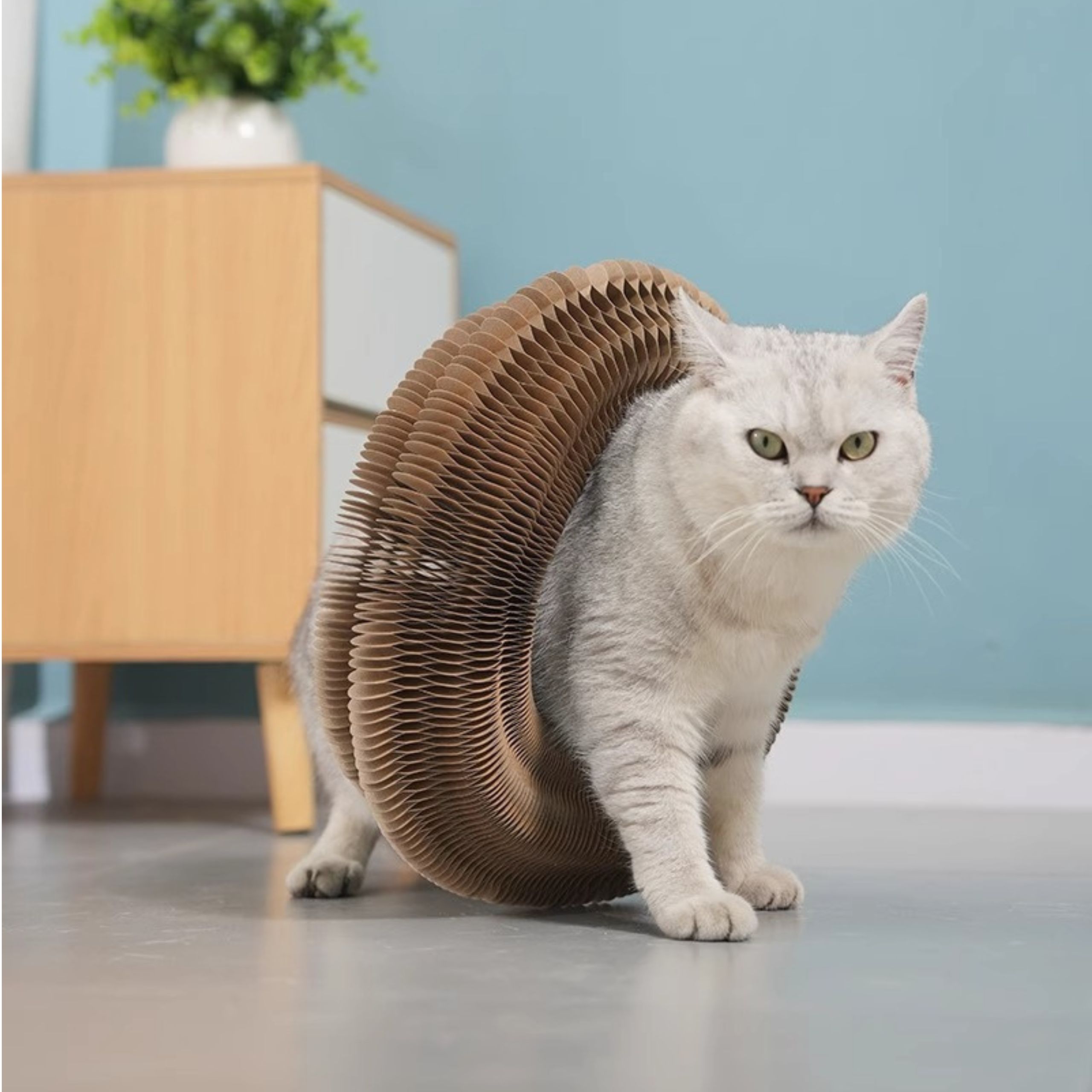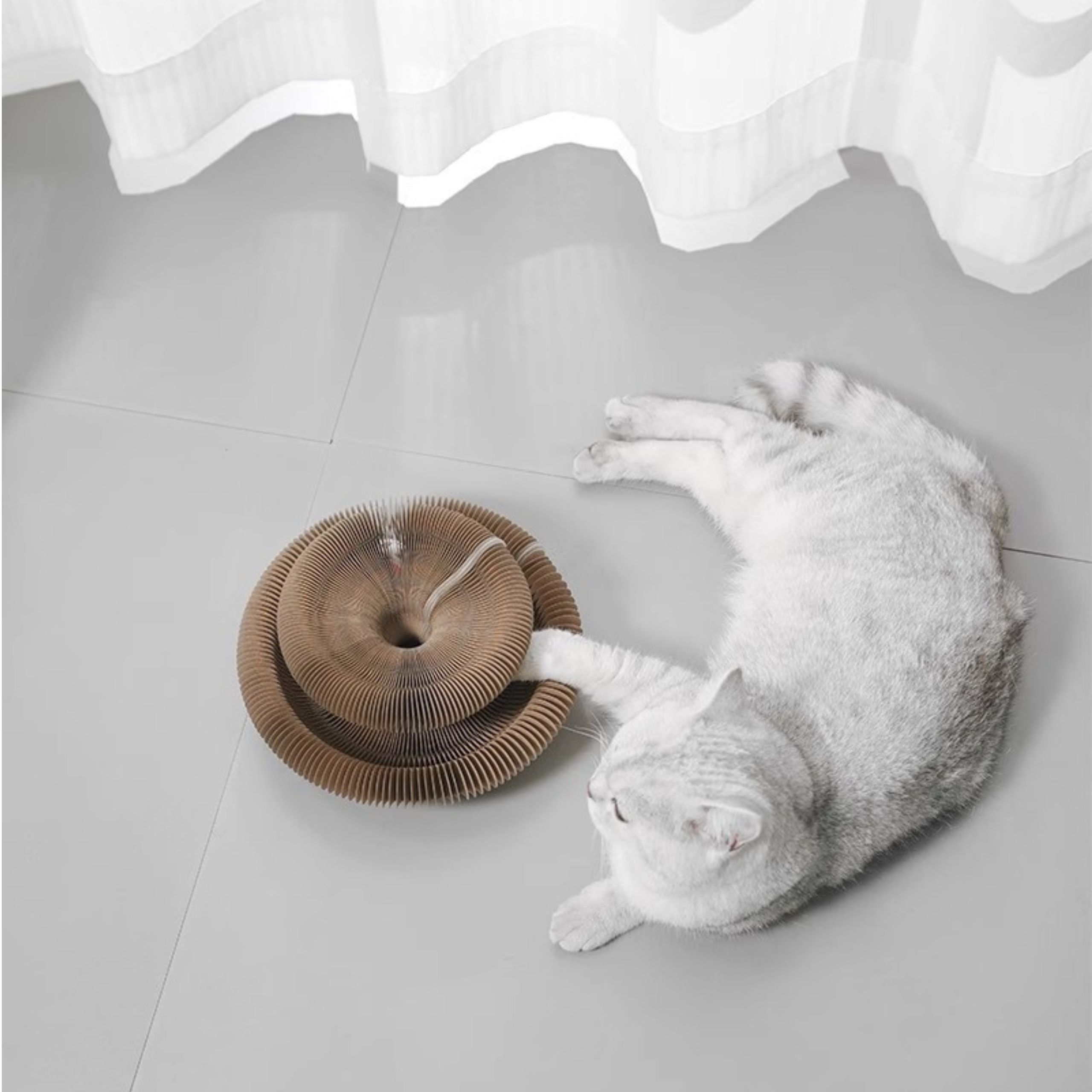 Po zakończonej zabawie, drapak można łatwo złożyć, dzięki czemu zajmuje niewiele miejsca. Wykonany z ekologicznych materiałów, jest bezpieczny zarówno dla kota, jak i dla środowiska.
